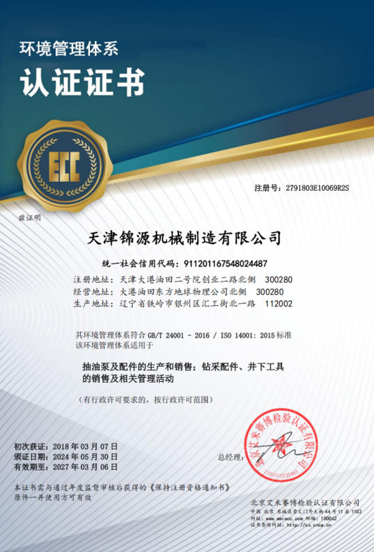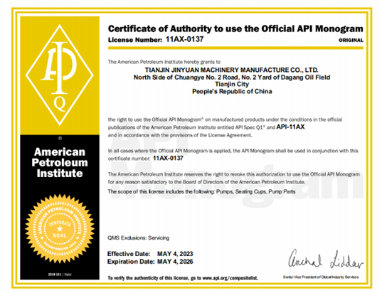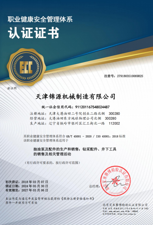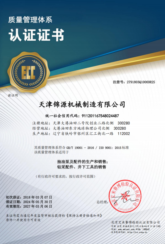 公司于2003年通过了IS09001质量体系认证,2009年取得“API” 认证,并通过了 ISO14001、OHSAS18001 体系认证,2008 年获得了抽 油泵产品《全国工业生产许可证》。各类证书经历了多次换证复查, 均顺利通过并保持有效至今。完善的质量控制体系,精良的生产设备和齐全的计量检测设备,为公司抽油泵及其组件生产与销售提供 了全方位的质量保障。 公司产品主要分布于大港油田、大庆油田、胜利油田、华北油田、新疆克拉玛依新港油田、长庆油田分公司等市场。同时,公司 还致力于开拓国际市场,目前已和阿塞拜疆、加拿大,美国等国外 客户建立了市场关系。